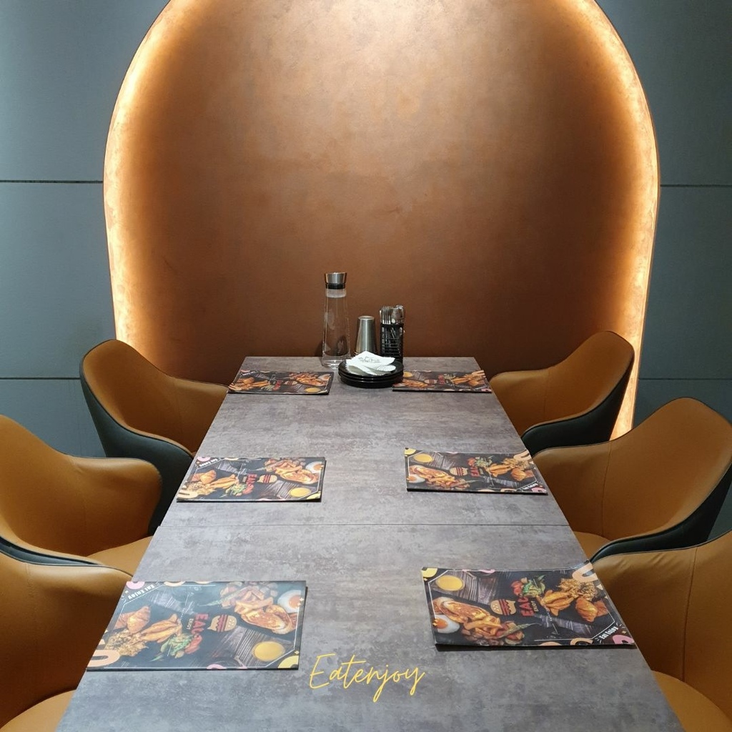 美式餐廳的大多是帶有「美式」、「熱情」、「復古」的意象,搭配店內的視覺元素,暖黃的燈光跟亮橘色調,讓整個用餐空間活潑又舒適。