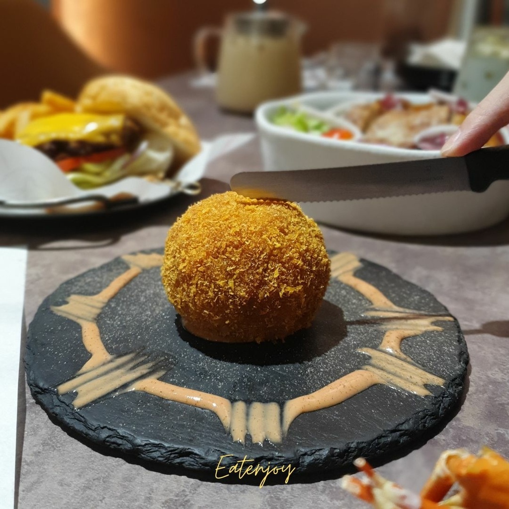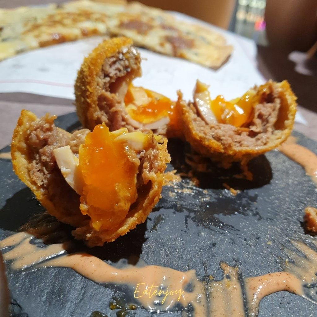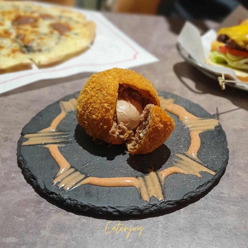 這不是出奇蛋,這是蘇格蘭蛋! 炸的酥酥的外層,切開後帶著絞肉,接著是包覆在最裡面的溫泉蛋,這口感好熱鬧。是小孩也會喜歡的菜品~