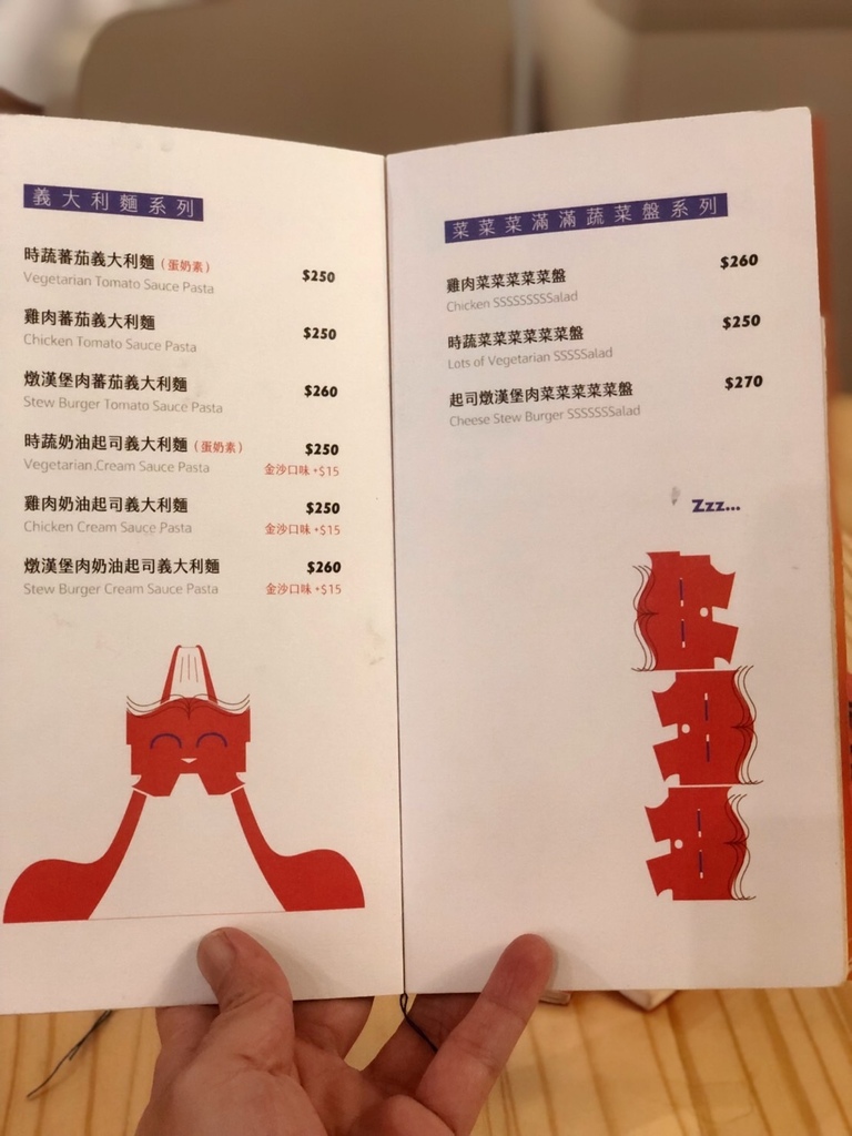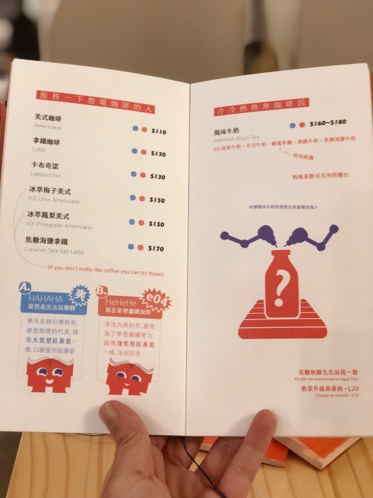 橘紅色的菜單,光看就能引起食慾。裡面的飲品跟菜品名稱,更是好玩到不行。