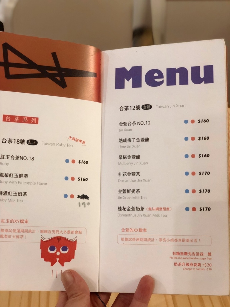 台茶的茶味比較明顯,喜歡茶感多點的,可以點台茶12號。因為本來就喜歡桂花跟金萱,所以就點桂花金萱茶。至於紅茶君啊...抱歉!那頁沒拍到...