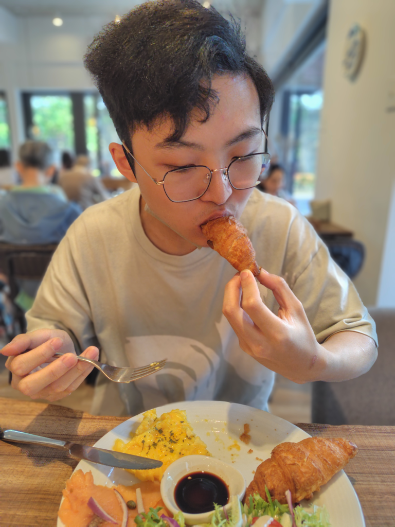 這孩子懂吃,先搶走我的可頌跟鮭魚...那個...記得留給我...