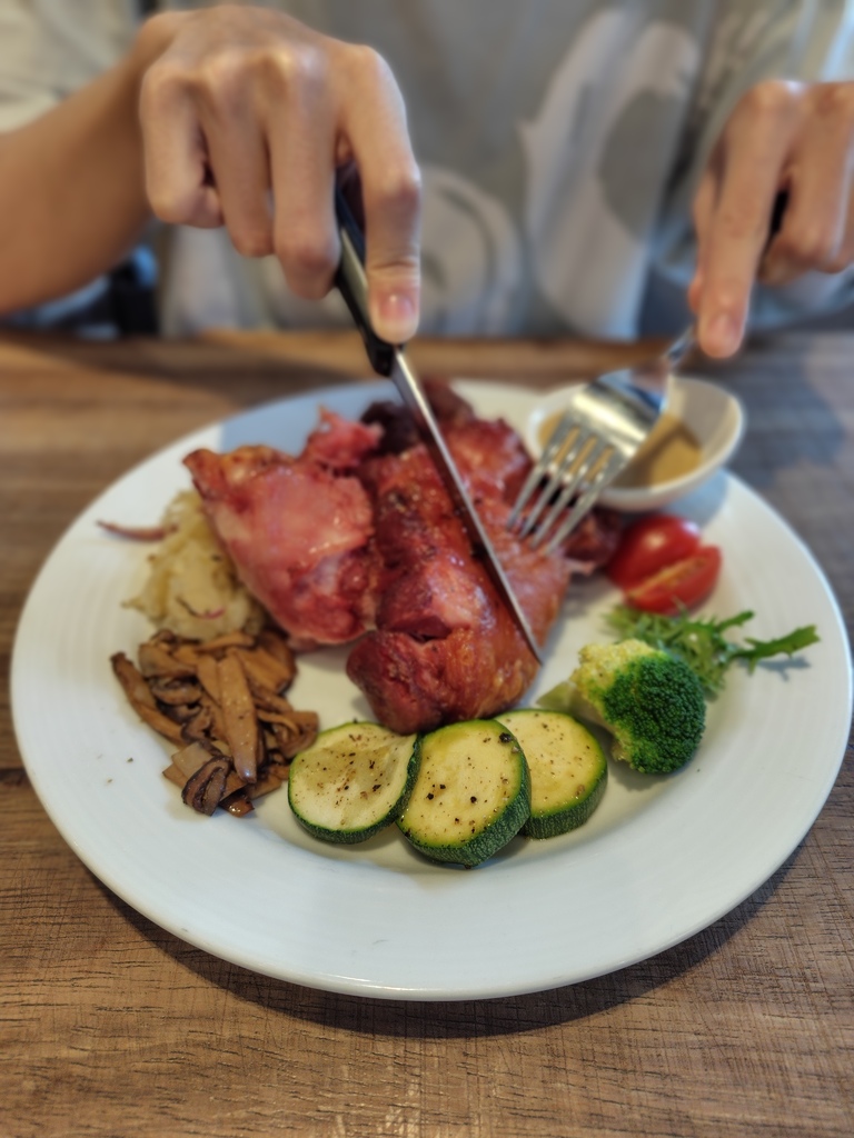 德國豬腳的油光超美,看了就食慾大開,鹹度恰到好處外,連時蔬都有豬腳的香氣。會讓人一口接一口~ (天知道!我好愛櫛瓜跟豬腳)