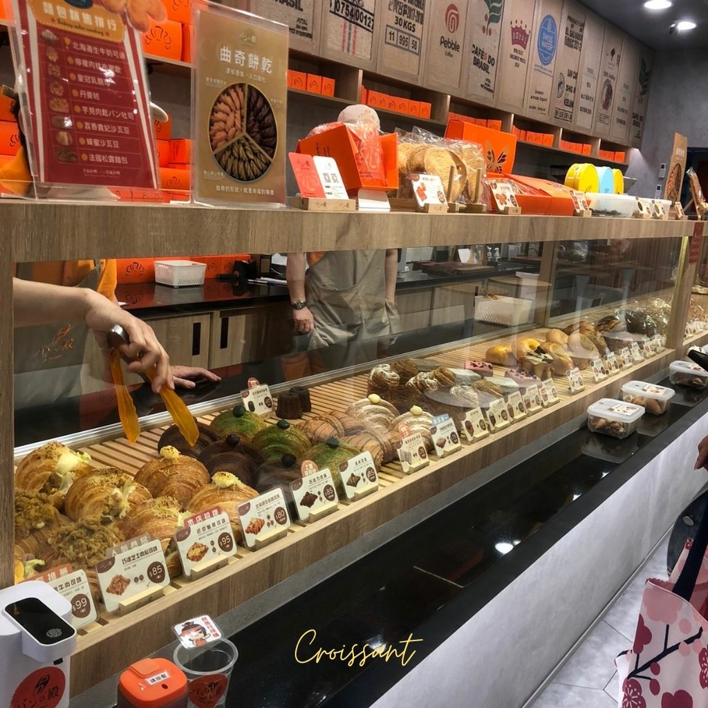 陳列式的麵包櫃,有主打的可頌、貝果、千層魔方及曲奇