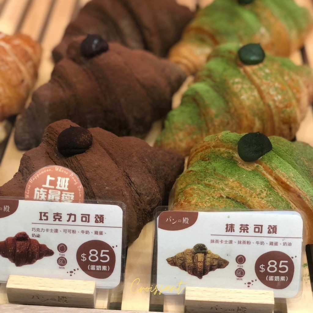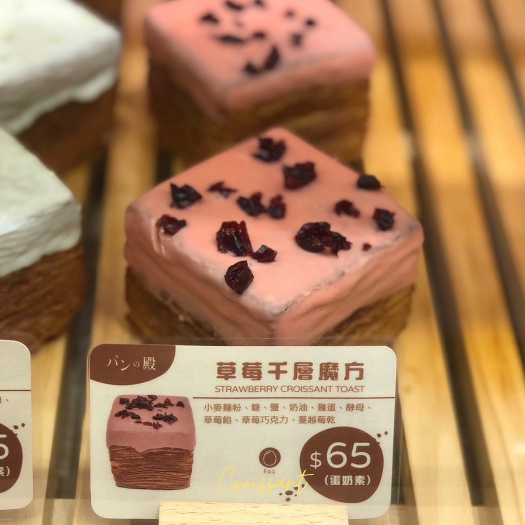 胖殿的可頌跟貝果都有鹹甜的口味可以選,當天我試吃後選了抹茶可頌跟草莓千層魔方,閨蜜買了蝴蝶扁可頌還有貝果。