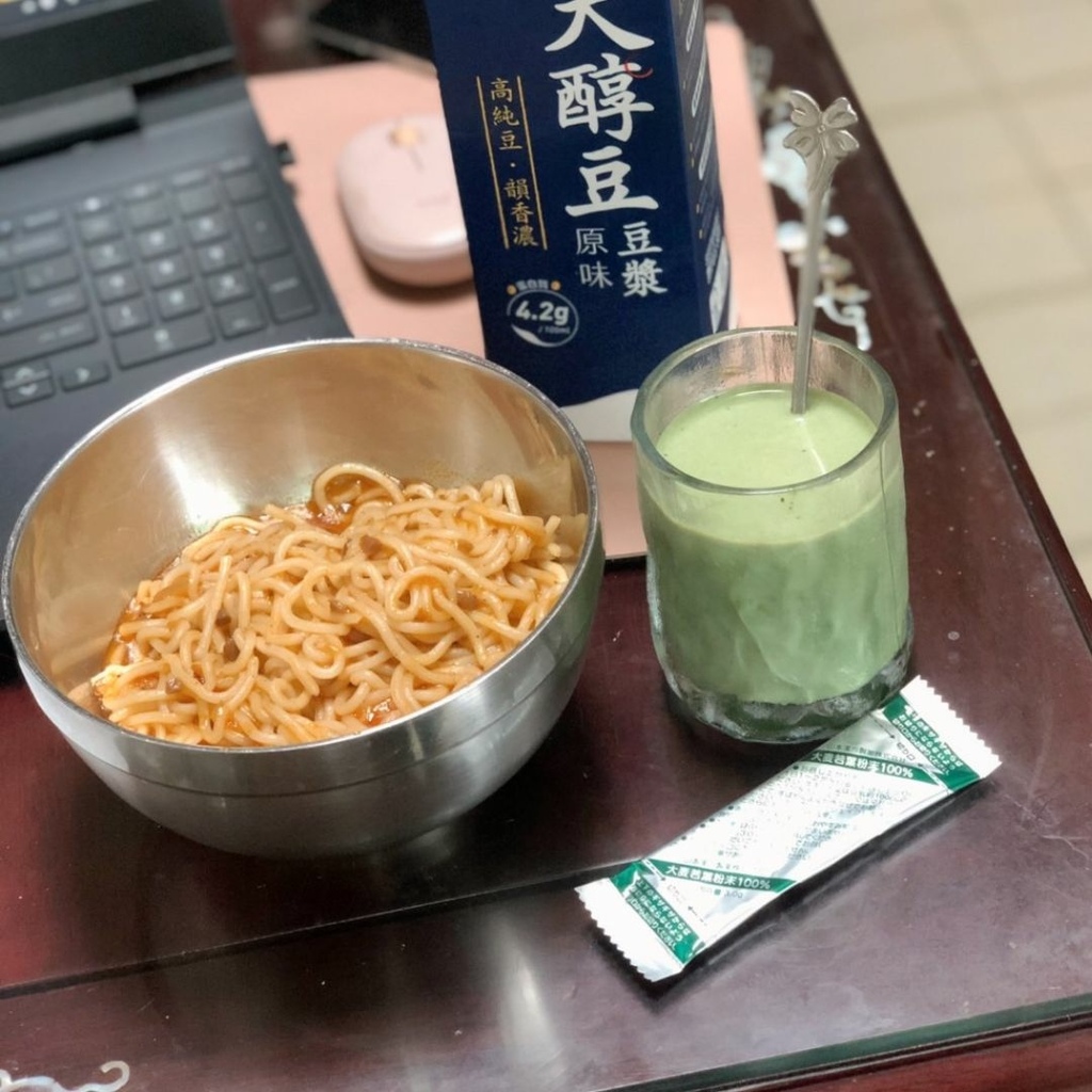 台灣人愛的鐵板麵早餐,我也會搭配豆漿+大麥若葉,這樣吃除了避免過量,也還能輕鬆解決每日蔬菜營養素不足的問題。