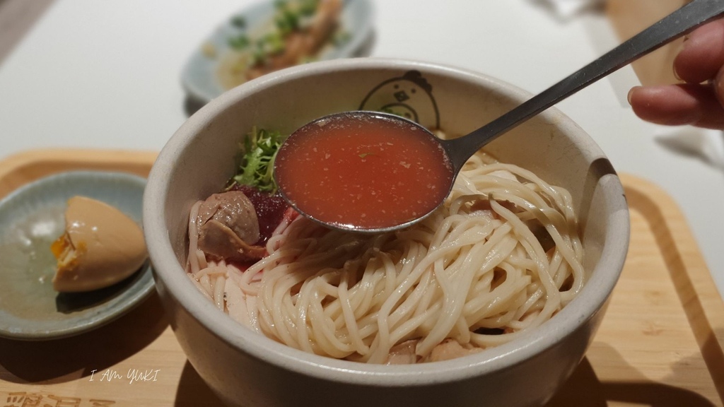 櫻花綻放後的湯頭呈現淡雅的橘紅色,喝起來櫻花香氣沒那麼明顯,就是很明顯的柚子味(有點小失落...我的櫻花呢...)。但就湯頭的整體表現我是喜歡的,每一口的柚子香伴著麵條很爽口,如果是冷麵的湯頭應該也很適合吧!