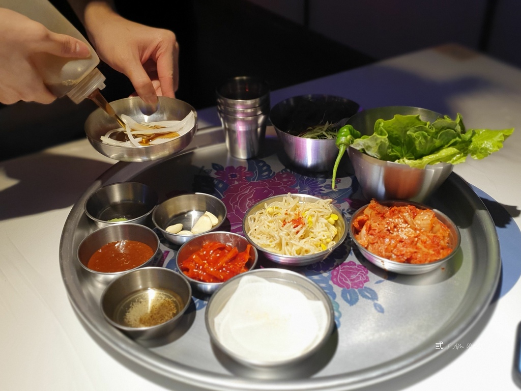 上桌就讓我們歡呼的「嗨某尼」(中文奶奶),滿滿的繽紛小菜、新鮮生菜、還有沾醬,就像奶奶不怕你吃只怕你餓到一樣,能吃就盡量續。生菜裡面還有紫蘇葉,包上起司香草豬入口很香~