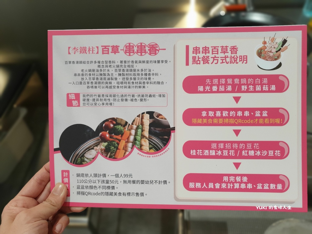 「李鐵柱百草串串香」的菜單非常簡單清楚,鍋底是以人頭算,一個人99元。