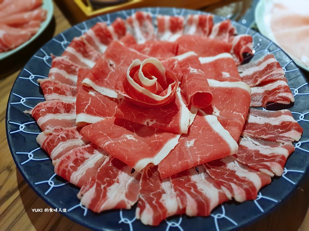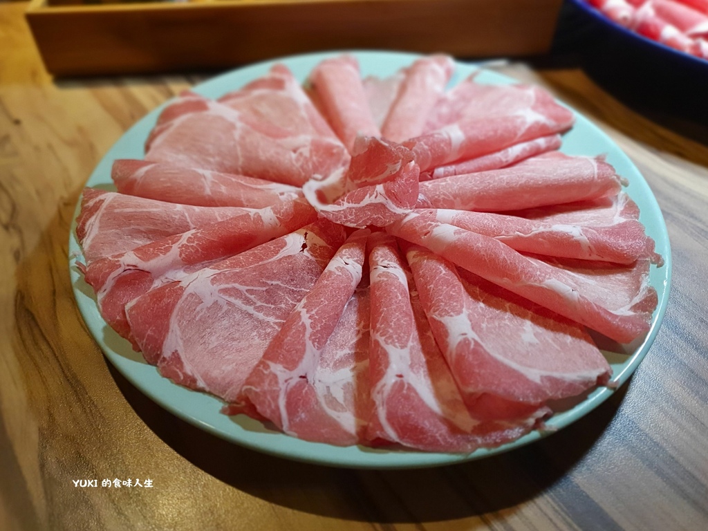 ▼丹麥安心梅花豚 梅花豬肉的油質多一點,口感軟嫩中帶著咬勁,跟雞白湯老火湯鍋的湯頭很搭