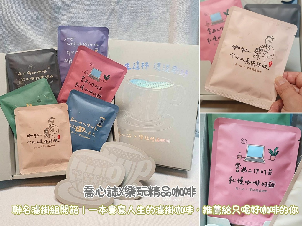 這次開箱的,是樂玩咖啡首次與手寫設計家「喬心誌」聯名推出的濾掛禮盒「人生這杯,濃淡剛好」。