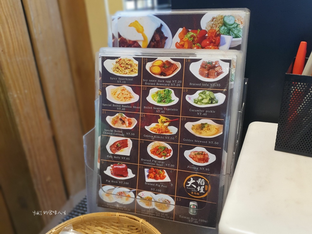 ○滷肉飯(小) $35 ○半熟荷包蛋 $20 ○辣酸菜 $10 ○醃小黃瓜 $40 ○魯筍絲 $40 ○魯油豆腐 $20 ○金針湯 $40