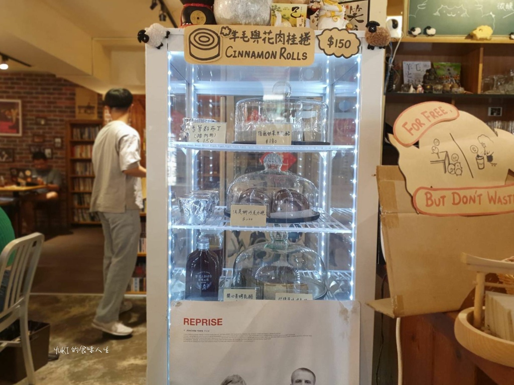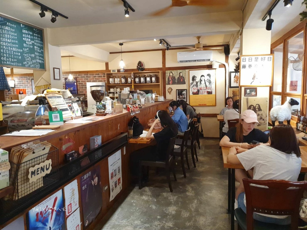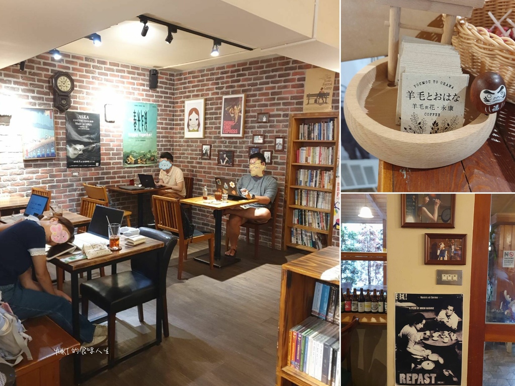 「羊毛與花 ‧ 永康」室內以紅磚牆與木質桌椅構成,牆上掛著音樂與電影的海報,還有滿滿的書架,就像是一處小小的藝文角落。點杯咖啡、一個肉桂捲,隨意翻本書,就能待上一個午後。